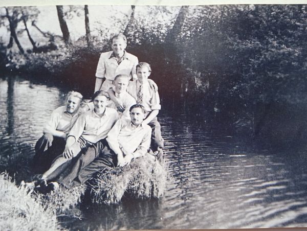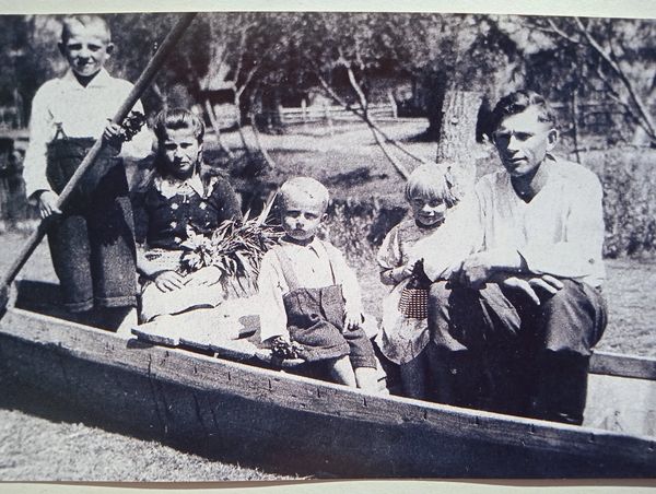 Lata czterdzieste. Od prawej: p. Krzyżanowski, córka Barbara, obok córki syn Ludwik rocznik 1939, wiosło trzyma Józef rocznik 1930, z zielem na kolanach siostra p. Krzyżanowskiego rocznik 1935 r,
