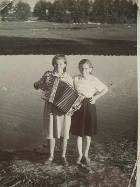 Rok 1956, pierwsza od lewej z akordeonem p. Teresa Krzyżanowska i jej koleżanka z Monisk, p. Kazimiera Czajkowska (ukończyła farmację i w ostatnich kilkudziesięciu latach była właścicielką kilku aptek. Jaj mama pracowała w aptece w Jeziorzanach jako pomoc).