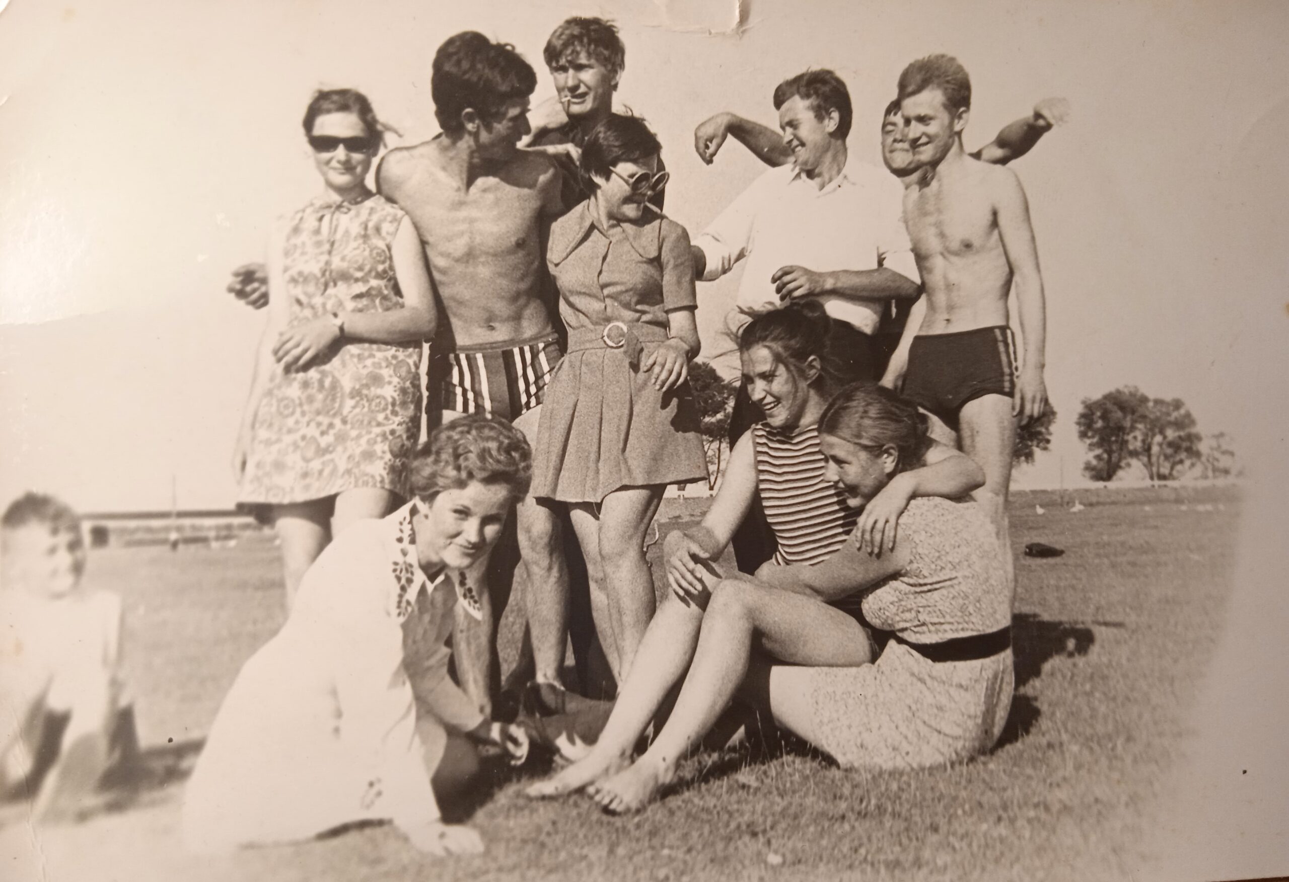 Od prawej patrząc na zdjęcie: w kąpielówkach Stanisław Krzyżanowski, widoczna głowa to Zdzisław Lemieszek, w białej koszuli Kazimierz Szabelski z ul. Młyńskiej, z papierosem Waldemar Gremplewski, obok niego Edward Kijek i pierwsza z lewej obok Kijka Maria Kępa, w środku w ciemnych okularach Kazimiera Szabelska, dziewczyna w bluzce w paski to Wanda Radzikowska, siedzi pierwsza od lewej Grażyna Ponikowska, ostatnia dziewczyna to być może Stanisława Szabelska.