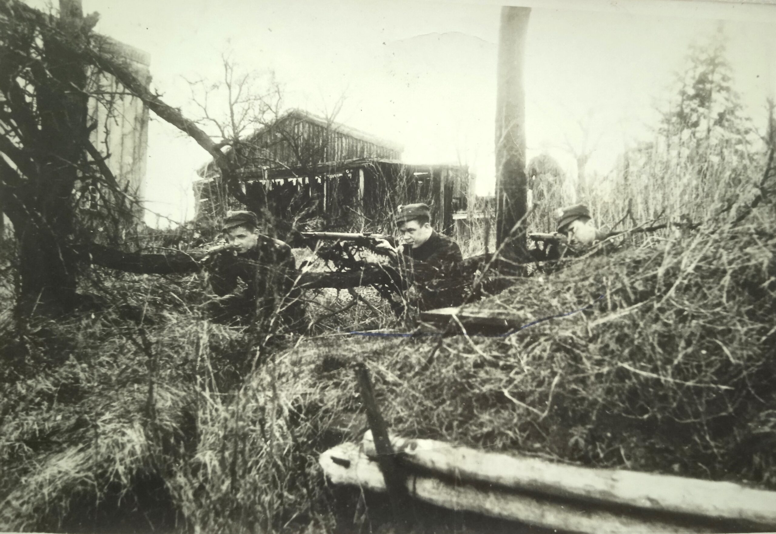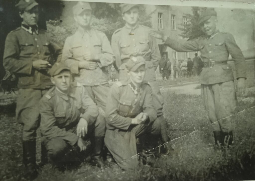 Zdjęcia pochodzą z archiwum rodzinnego. Pierwsza fotografia prawdopodobnie ukazuje walki frontowe. Na drugim zdjęciu stoi pierwszy od lewej p. Józef Rafalski. Czy pozostali to koledzy frontowi? Tego nie wiem.