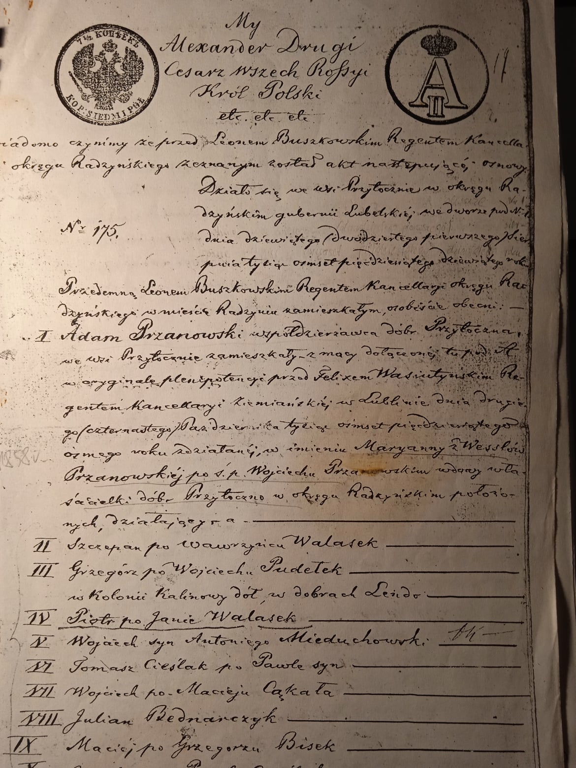 Marianna Przanowska przeznaczyła 120 morgów lasu Przytockiego z przeznaczeniem na utworzenie 8 gospodarstw każde po 15 morgów gruntu (ok. 8,4 h). Sprowadzeniem kolonistów na te grunta zajęli się osadzeni w tej kolonii Mateusz Rosporek i Kacper Antoniak. Jej syn Adam Przanowski wydzielił zaś 150 morgów, na których utworzono 10 gospodarstw każde również po 15 morgów (ok. 8,4 h). W tych 10-ciu gospodarstwach osadził następujących kolonistów: pod nr 9. Szczepana Walaska, pod nr 10. Grzegorza Pudełka, pod nr 11. Piotra Walaska – syn, pod nr 12. Piotra Walaska – ojciec, pod nr 13. Wojciecha Mieduchowskego, pod nr 14. Tomasza Cieślaka, pod nr 15. Wojciecha Cąkałę, pod nr 16. Juliana Bednarczyka, pod nr 17. Macieja Biska, pod nr 18. Onufrego Cieślaka. Nowo powstałej wsi nadano nazwę Walentynów, być może od imienia Walentyny Przanowskiej, która została małżonką Ignacego Kuszlla. Walentyna wniosła w wianie do tego związku majątek Przytoczno. Jakie relacje rodzinne łączyły Walentynę z Mariannę Przanowską czy też z jej synem, nie wiem.