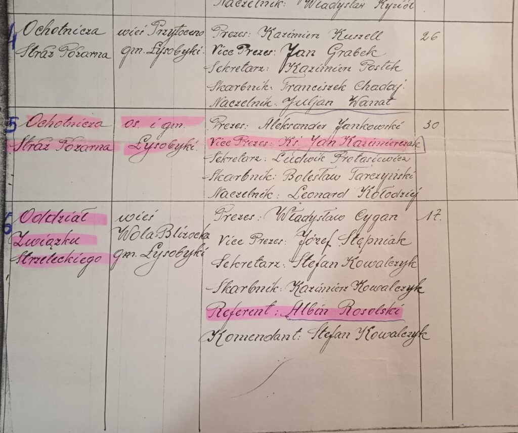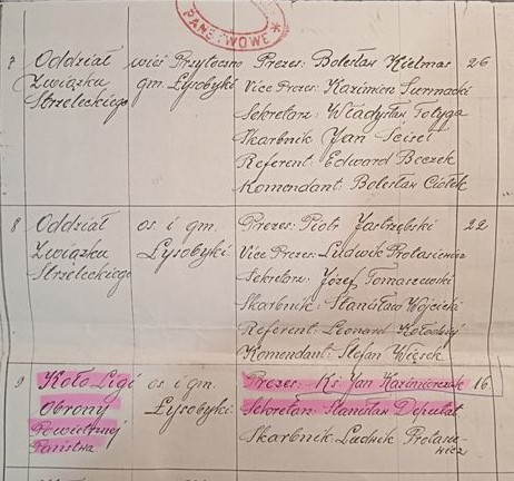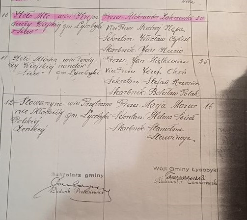 Wykaz organizacji działających przed wojną w gminie Łysobyki. Wykaz sporządził ówczesny sekretarz Ludwik Protasiewicz. Widnieje też pieczątka i podpis wójta Aleksandra Tomaszewskiego. Wykaz pochodzi z Archiwum Państwowego w Radzyniu Podlaskim.