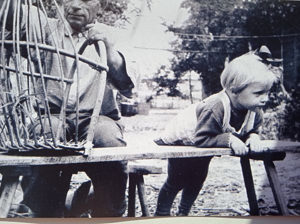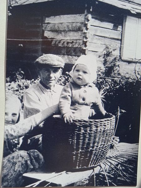 Wyplatanie koszy przez mieszkańców Łysobyk to jedna z wielu umiejętności. Niektórzy wyplatali je na sprzedaż, inni na własny użytek. Dzisiaj kilka osób nadal się tym trudni. Pozyskanie materiału, tzw. pręci nie jest problemem – wierzba jest powszechna. Jeziorzany leżą pośród łąk, bagien i starorzeczy Wieprza. Na zdjęciach p. Józef Krzyżanowski w towarzystwie najmłodszej córki i wnucząt przed domem rodzinnym na ul. Przejazd. Początek lat 60-tych.