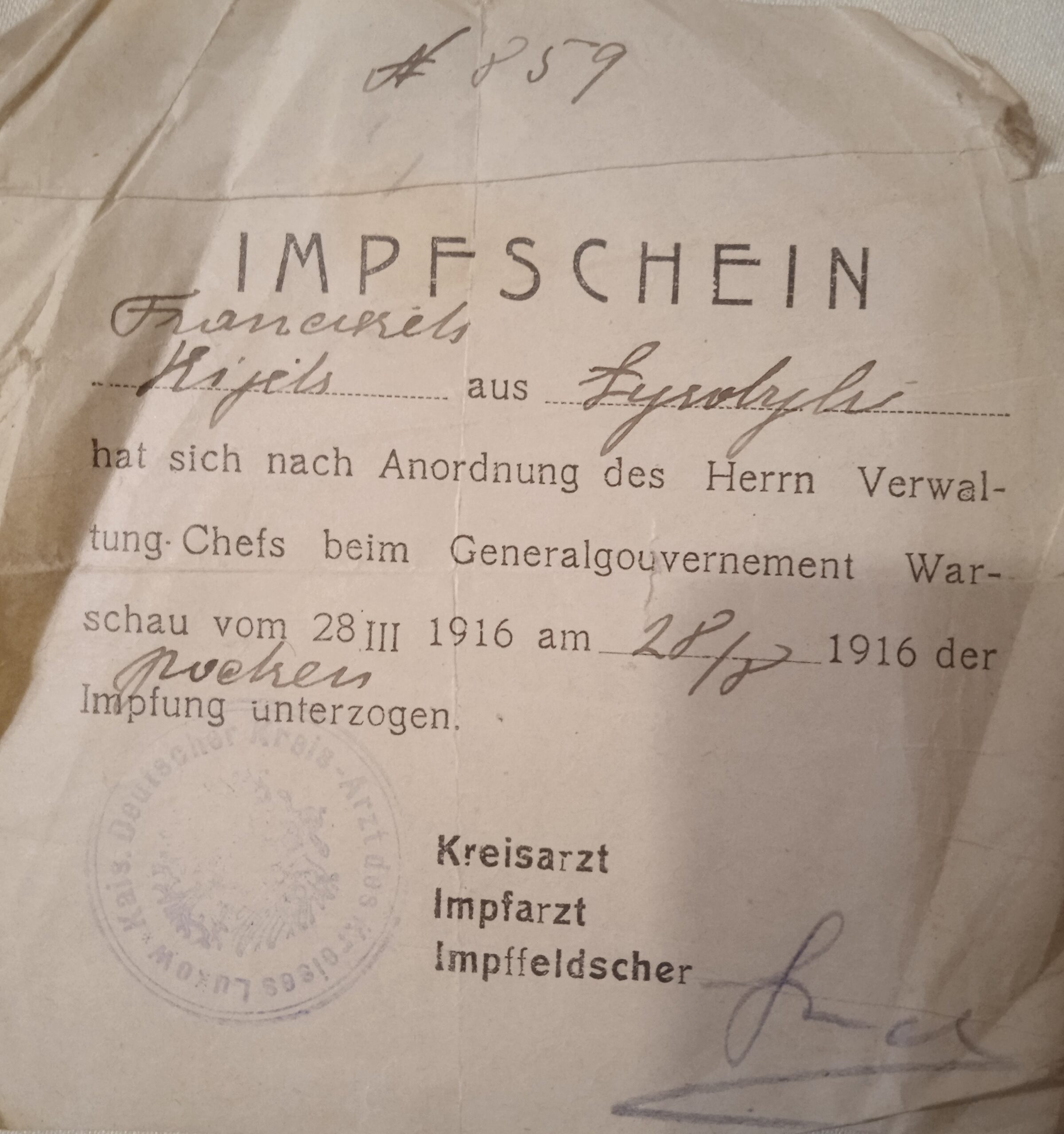 zgodnie z rozporządzeniem kierownika zarządu przy Generalnym Gubernatorstwie Warszawskim z 28 III 1916 poddał się szczepieniu 28/8 1916