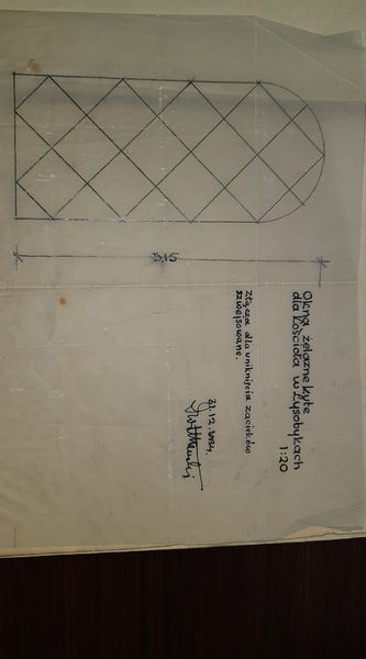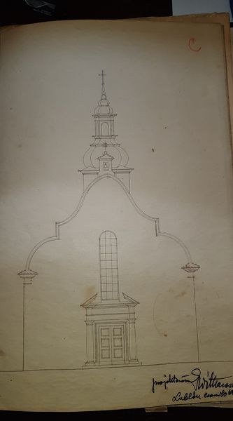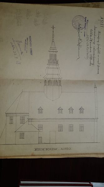 To zdjęcie ukazuje pierwotny plan przebudowy odrzucony przez władze kościelne .Na projekcie widnieje 1928r. projekt uwzględniał wiele elementów stylu barokowego.