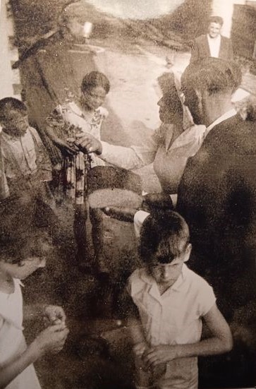Przed domem rodzinnym mojego ojca i moim na Budzyniu (ul. Warszawska). Państwo młodzi już rzucili dzieciom cukierki. Tata trzyma 1/3 blachy chleba, mama też po coś rękę wyciągnęła albo po sól, albo po kieliszek. To powitanie młodych przed domem.