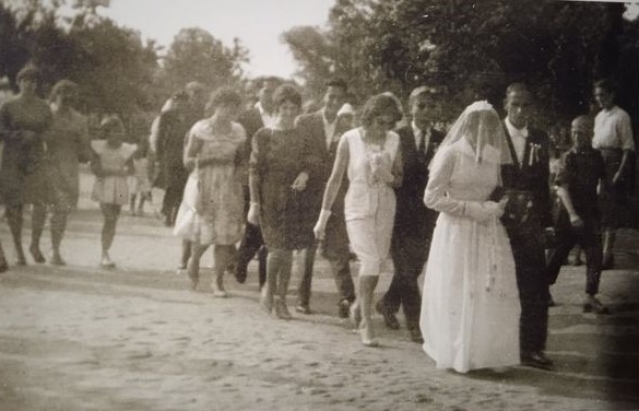 W drodze z kościoła. W tle ten biały budynek to organistówka, czyli dom, w którym mieszkał organista z rodziną. Wtedy organistą chyba był Goławski, albo jeszcze Ciszewski. Czwarty drużba w mundurze wojskowym to mój krewny Jan Suski z Garbowa. Z tej miejscowości pochodziła moja babcia ze strony ojca, dlatego przezwano nas Garbowiaki. Trzeci drużba (przed tym w mundurze wojskowym) to Stanisław Wojciechowski z Budzynia, sąsiad mojego ojca. Pierwszy drużba w ciemnych okularach to Noceń.