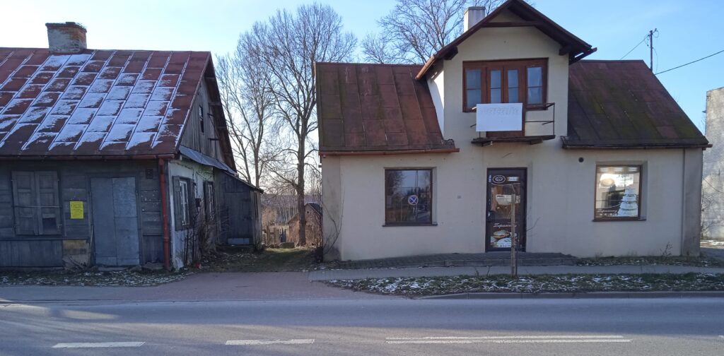 Na mapce oraz na zdjęciu widoczna jest „ulica bez nazwy”. Uliczkę tę wyodrębnił Jan Szabelski z Leonków, bądź jego ojciec, aby mieć dojazd do swojej posesji. Naprzeciwko domu Zyberfisza przy tej ulicy stoi do dziś dom będący własnością rodziny Krzyżanowskich (na zdjęciu szary budynek). Przed wojną prowadził w nim swoją działalność Piotr Jastrzębski. Poprzedni właściciel nabył niewielki kawałek działki od Szabelskiego z Leonków i wybudował ten dom. Kim była ta osoba, która wybudowała ten dom? Wiem tylko, że to Żydówka, która w 1926r. sprzedała go Jastrzębskiemu. Akt notarialny spisano w kancelarii w Łukowie. Budynek posiada cechy charakterystyczne dla budowli żydowskich – wejście do domu z kilku stron: od wschodu (od ulicy Warszawskiej, dzisiaj Rynek), północy (od „ulicy bez nazwy”) i zachodu (od strony Szabelskich Leonków). Inną jego cechą charakterystyczną są bardzo głębokie i zasobne piwnice, jak mi mówiono, nigdy nie stała w nich woda mimo bliskości rzeki. Piotr Jastrzębski prowadził restaurację. W piwnicach przechowywał beczki z piwem i inne produkty spożywcze. W artykule „W Lubelskiem”, który ukazał się w „Tygodniku Ilustrowanym” w sierpniu 1937r. właściciel restauracji tak odpowiedział na pytanie redaktora, z czego żyje: „Ja tylko z wiosek, zawsze tam ktoś kupi coś, szczególniej na wynos, trochę wódki, wędlin, czasem tytoniu lub papierosów. Dzisiaj trudniej, bo na wsiach powstało ostatnimi laty dużo polskich sklepików, które zagarniają coraz więcej handel miasteczkowy”. Piotr Jastrzębski mieszkał w domu, który stał w miejscu, gdzie obecnie jest wejście do pawilonu handlowego, ale o tym domu w innym poście. Jastrzębski zginął w Oświęcimiu. Po wojnie w 1956r. dom stał się własnością Haliny i Władysława Krzyżanowskich. Pani Halina nazywana była „Lodziarą”, gdyż wyrabiała i sprzedawała lody, bardzo dobre.