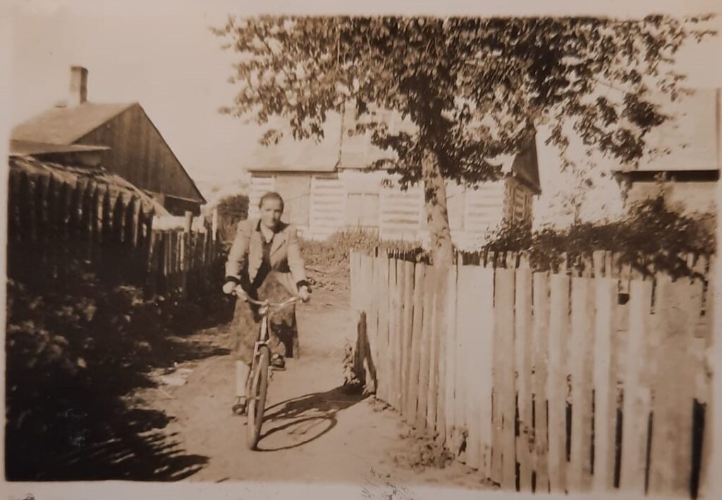 W głębi „stare biuro”(budynek w paski), po lewo puste miejsce po spalonym domu rodziny Kowalskich, dalej po lewo widoczny dach nieistniejącej piekarni. Zdjęcie dzięki uprzejmości p. Jolanty Kubisiak.